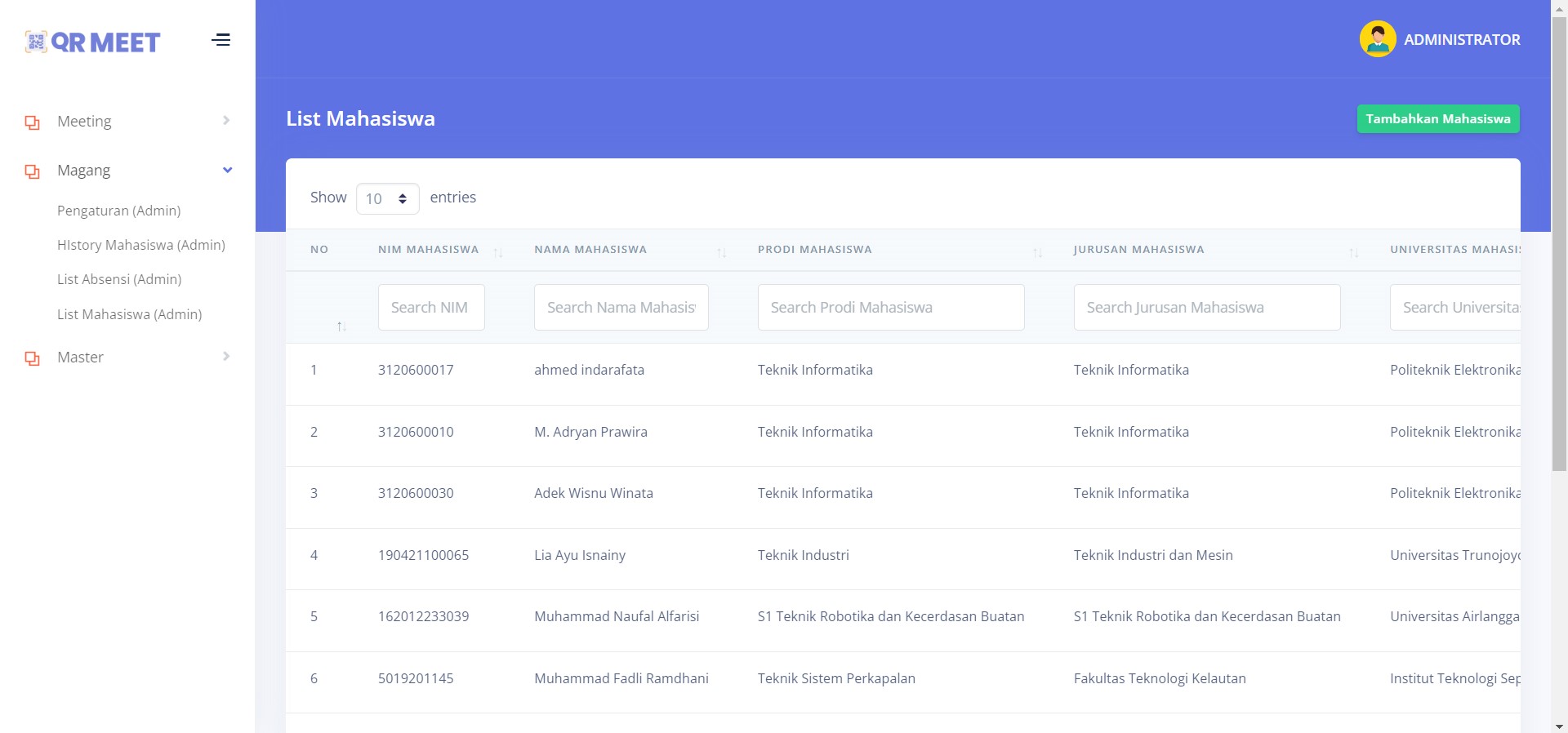 QR-Meet is a web application developed with CodeIgniter, HTML, CSS, and Bootstrap, designed specifically for internship students at Terminal Teluk Lamong. This application provides a centralized platform to display essential information about interns, including personal details, project assignments, and attendance records. With its user-friendly interface, QR-Meet streamlines access to intern data, enhancing communication and organization within the internship program.
